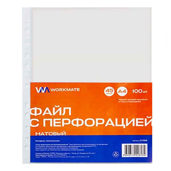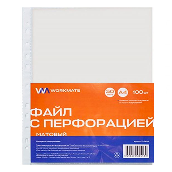 Файл-вкладыш с перфорацией А4 50мкм гладкая поверхность 100шт/уп WORKMATE 15-8744 [3690572025142] (313003)